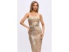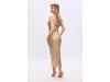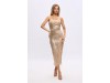 Rochia maxi din dantela, este o alegere eleganta si rafinata pentru evenimente speciale. Materialul fin de dantela, accesorizat cu paiete aurii, confera un efect stralucitor si sofisticat. Croiul lung, usor evazat, creeaza o silueta feminina si fluida, iar decolteul discret pune in valoare linia gatului. Fara maneci, rochia este perfecta pentru a fi purtata in serile calde, oferind un aer de glamour si stil.