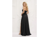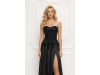 Acest compleu de seara este format dintr-un corset structurat si o fusta lunga, ambele realizate intr-o nuanta eleganta de negru intens. Designul imbina armonios textura lucioasa a materialului de baza cu detaliile pretioase aplicate manual. Corsetul, cu un decolteu in forma de inima, pune in evidenta linia umerilor. Intreaga suprafata a corsetului este acoperita de broderii complexe, margele si paiete negre, oferind un aspect stralucitor si sofisticat.In partea de jos a corsetului se observa un rand de franjuri fini din margele, care cad peste talie si creeaza o legatura fluida intre cele doua piese. Fusta este confectionata din tafta sau satin plin, avand un croi amplu care curge pana la nivelul solului. Elementul central al fustei este crapatura adanca pe piciorul stang, care adauga o nota indrazneata si permite o mai buna libertate de miscare.