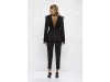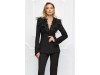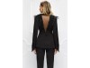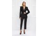 Compleul este elegant si sofisticat, realizat integral in nuanta clasica de negru, potrivita pentru evenimente speciale sau aparitii de seara. Este format din sacou cambrat si pantaloni drepti, cu o croiala care alungeste silueta si ofera un aspect rafinat si feminin. Sacoul are un decolteu adanc in forma de V, accentuat cu aplicatii decorative bogate, formate din broderii, paiete si pene fine, care adauga textura si un aer spectaculos tinutei. Manecile sunt lungi, iar la terminatie sunt decorate cu aceleasi detalii elegante, creand un echilibru vizual intre partea superioara si cea inferioara. Spatele este deosebit si foarte feminin, realizat din tull negru transparent, decorat cu dantela fina, care adauga un plus de senzualitate si rafinament. Acest detaliu transforma compleul intr-o piesa statement, ideala pentru femeile care isi doresc o aparitie eleganta, moderna si memorabila. Pantalonii sunt simpli, cu o linie dreapta si lungime pana la glezna, completand armonios sacoul si pastrand atentia pe detaliile elaborate ale acestuia.