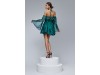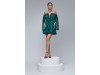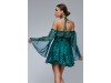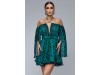 Aceasta rochie scurta are un design exotic si seducator, realizata dintr-un material vaporos cu imprimeu animal print in nuante de verde si negru. Modelul este cu umerii goi si are un decolteu adanc in V, sustinut discret de un cordon subtire ce se leaga in jurul gatului. Manecile sunt lungi si largi, oferind o nota eleganta si fluida. Talia este evidentiata printr-un cordon in acelasi imprimeu, iar fusta are volane asimetrice care adauga dinamism si feminitate tinutei. Rochia este completata de sandale negre cu toc inalt si accesorii fine, creand un look sofisticat si puternic, potrivit pentru evenimente de seara sau petreceri.