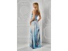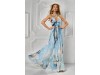 Aceasta rochie lunga este o piesa spectaculoasa si diafana, ideala pentru evenimente de vara sau aparitii elegante. Realizata dintr-un material fluid, cu imprimeu in nuante de albastru si crem, creeaza un efect vizual ce aminteste de pictura in acuarela. Decolteul adanc in V si bretelele subtiri pun in valoare bustul, iar talia marcata cu drapaje evidentiaza silueta feminina. Fusta ampla, cu un croi lejer si mult volum, se misca fluid la fiecare pas, conferind tinutei gratie si romantism. Este o rochie care atrage atentia prin rafinament si delicatete.