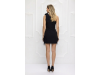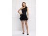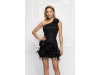 Rochie mini neagra cu un design asimetric pe un singur umar, acesta fiind decorat cu o aplicatie florala 3D sub forma unui trandafir voluminos. Intreaga piesa este acoperita de broderii stralucitoare din paiete argintii dispuse in linii curbe care urmaresc liniile corpului, oferind un aspect pretios si dinamic. In partea de jos, rochia este accesorizata de flori in forma de trandafiri 3D texturati care adauga volum si o nota romantica intregii tinute. Marginea inferioara este finisata cu o bordura bogata din pene fine de culoare negru care confera miscare si un plus de rafinament tinutei de ocazie.